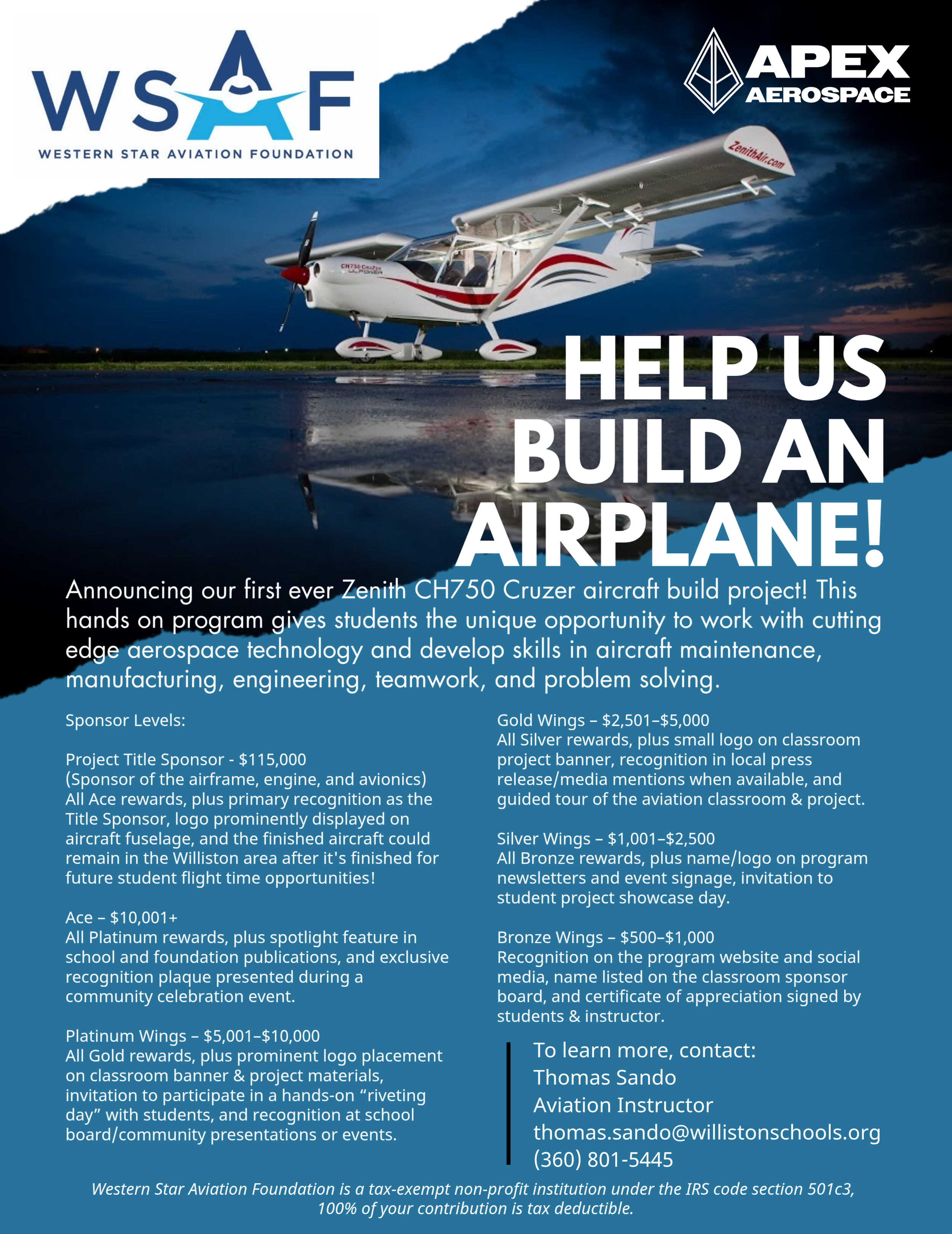 WSAF is currently looking for support for the engine, avionics, and finishing components to If you would like to support this project.